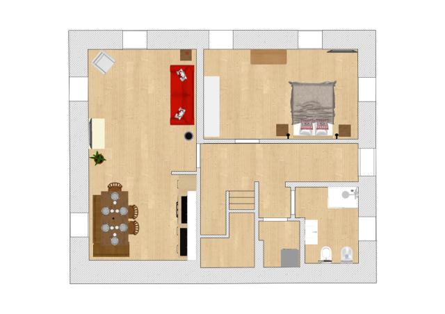bilo 4: 60 m² - 1 spálňa s manželskou posteľou, obývacia izba s kuchynským kútom a rozkladacím gaučom pre 2 osoby, sociálne zariadenie; apartmán je situovaný na prízemí